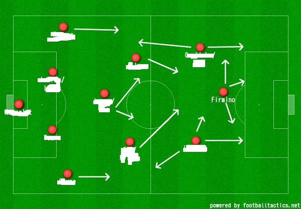 His role? Simple; dropping deep to collect the ball from the mid and creating chances to support the likes of Mane & Salah who prefer to cut inside to score the bulk of Liverpool’s goals. Salah & Mane would also be seen dropping in deep vertically closer to the midfield line along with Firmino, which allows the Brazilian to act as a pivot to release the other 2 attackers who are relatively quicker, also due to his ability of collecting the ball and turning quickly, losing a marker to pass the ball to the attackers, this allows Liverpool the ability to transition quickly from defence to attack.