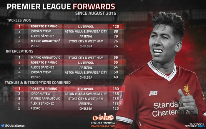 We can easily say Firmino is an all-round player: he can score, create, drop off the attack in the mid to make the assist or win the ball across the pitch by intercepting the opponents pass or even tackle if required, though that may not be his best attribute. Despite that, his defensive contribution and output is higher than many strikers present in the league.